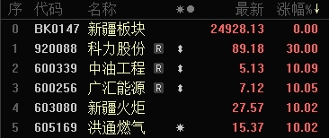 今日,科力股份上涨30.00%,报收89.18元;中油工程上涨10.09%,报收5.13元;广汇能源上涨10.05%,报收7.12元;新疆火炬上涨10.02%,报收27.57元;洪通燃气上涨10.02%,报收15.37元。卓郎智能、金风科技、立昂技术、博纳影业、特变电工跌幅居前。