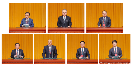11月18日,在2025新商大会上,中国工程院院士彭苏萍、中国华电集团总经理叶向东、浙江恒逸集团总裁倪德锋、特变电工董事长张新、阿联酋中国新疆商会暨同乡会会长阿不来提·买买提、上海新疆商会会长韩宇泽发言。新商联盟主席杨剑发布联盟倡议(由上至下、由左到右)。石榴云/新疆日报记者崔志坚摄