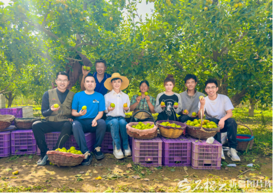2024年9月,贺娇龙(前排左三)在库尔勒市一处香梨园和果农一起拍宣传片。资料图片