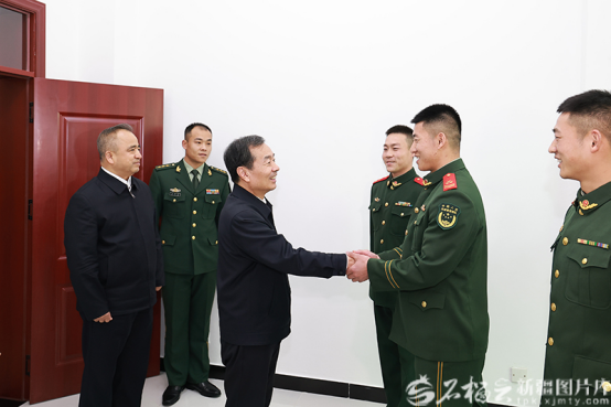 2月13日,自治区党委书记陈小江、自治区主席艾尔肯·吐尼亚孜在武警新疆总队南疆某部,看望慰问部队官兵。石榴云/新疆日报记者崔志坚摄